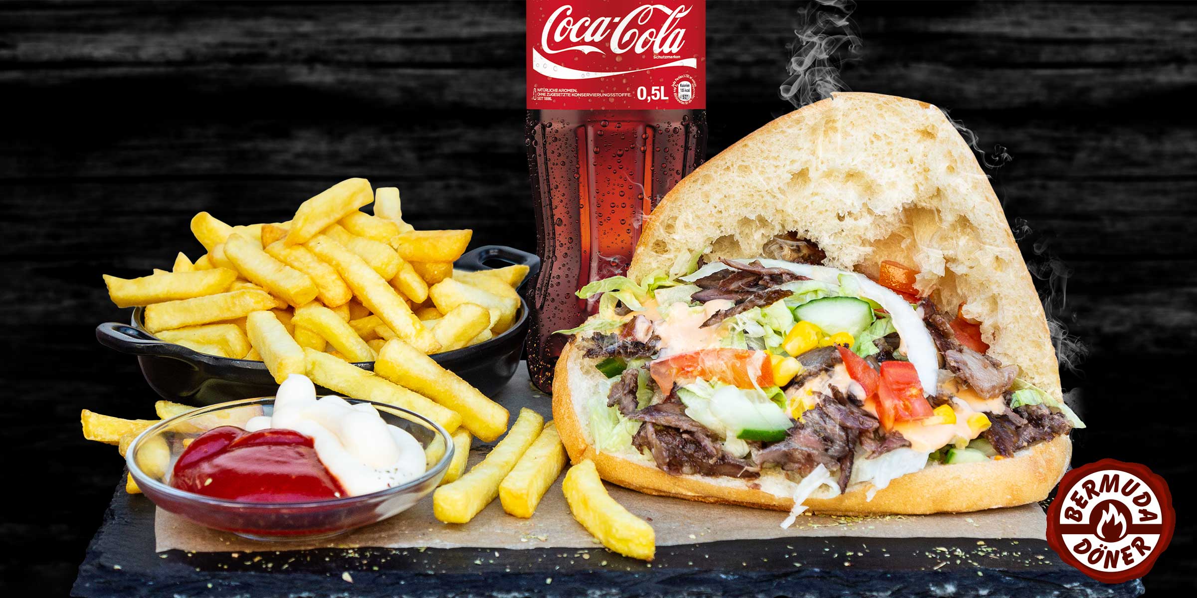 Leckerer Döner aus Kalbfleisch. Salat und Soße nach Wahl. Dazu Pommes und Softdrink (0,5L).